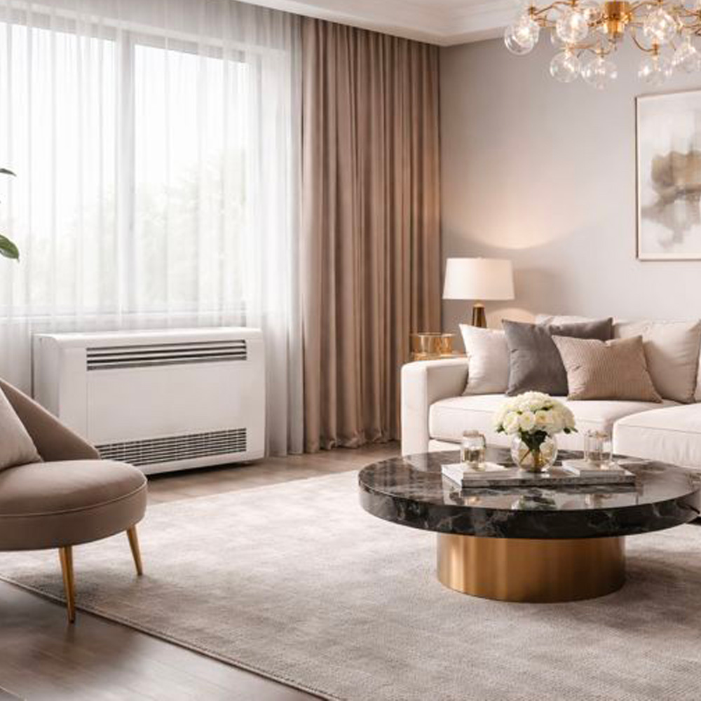 Unità compatta installabile a parete bassa o a pavimento. Combina design funzionale, distribuzione dell’aria efficace e comfort sia in raffrescamento che in riscaldamento.